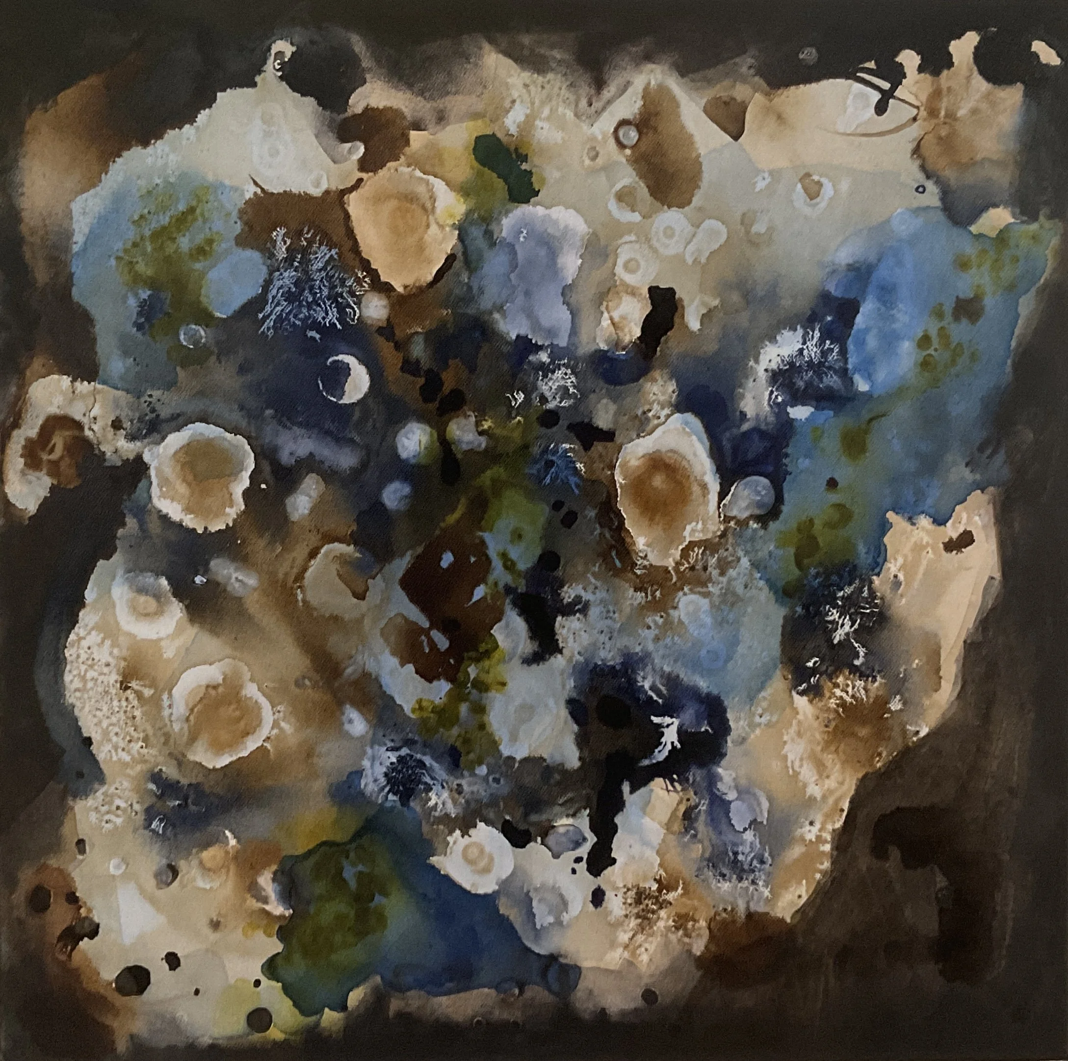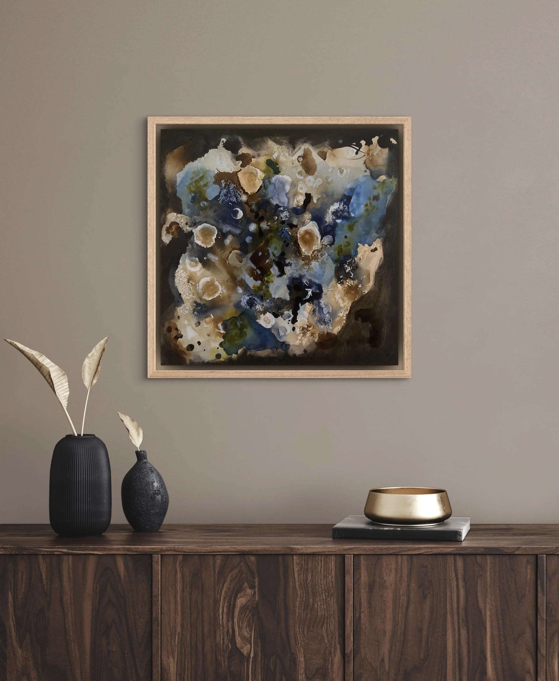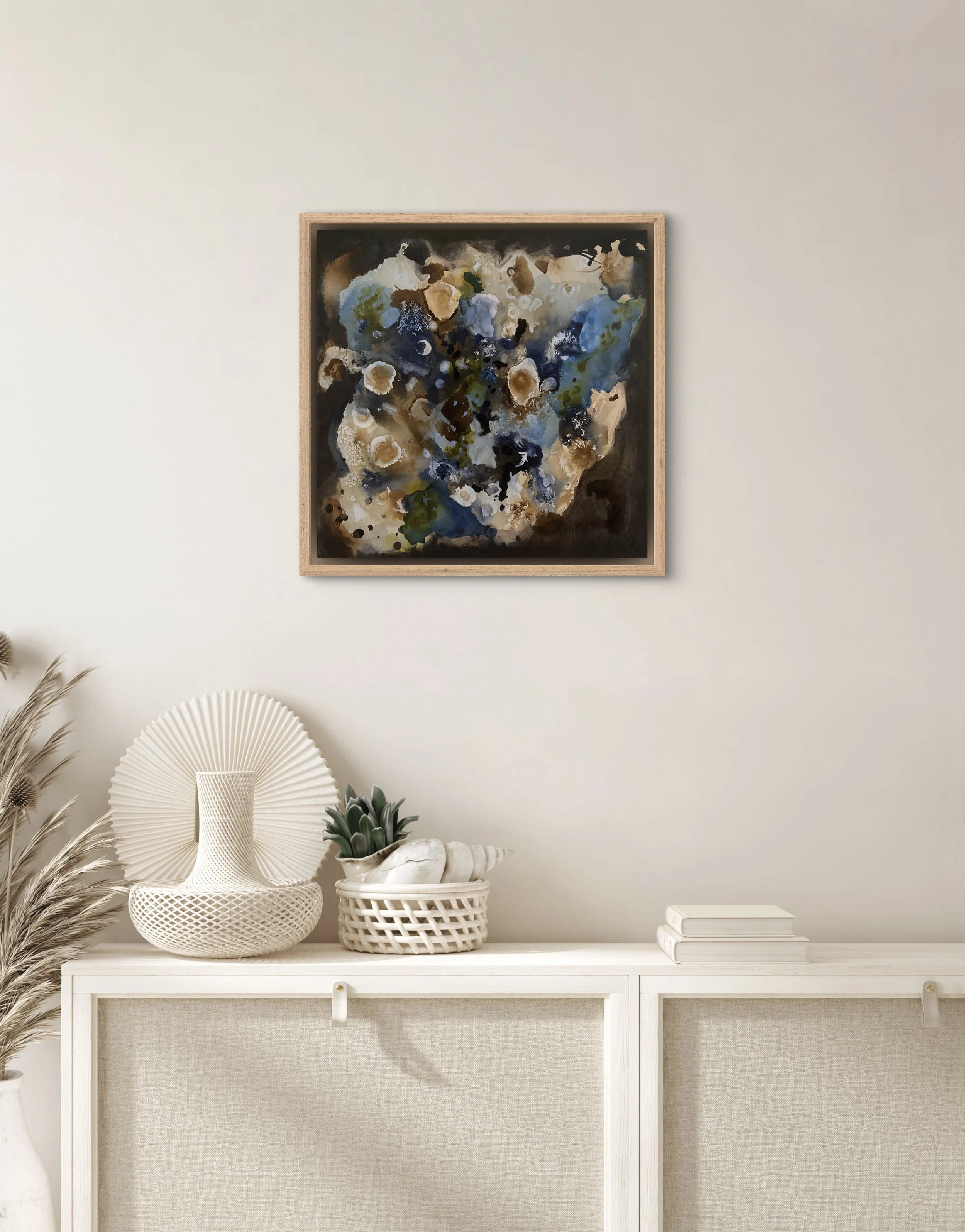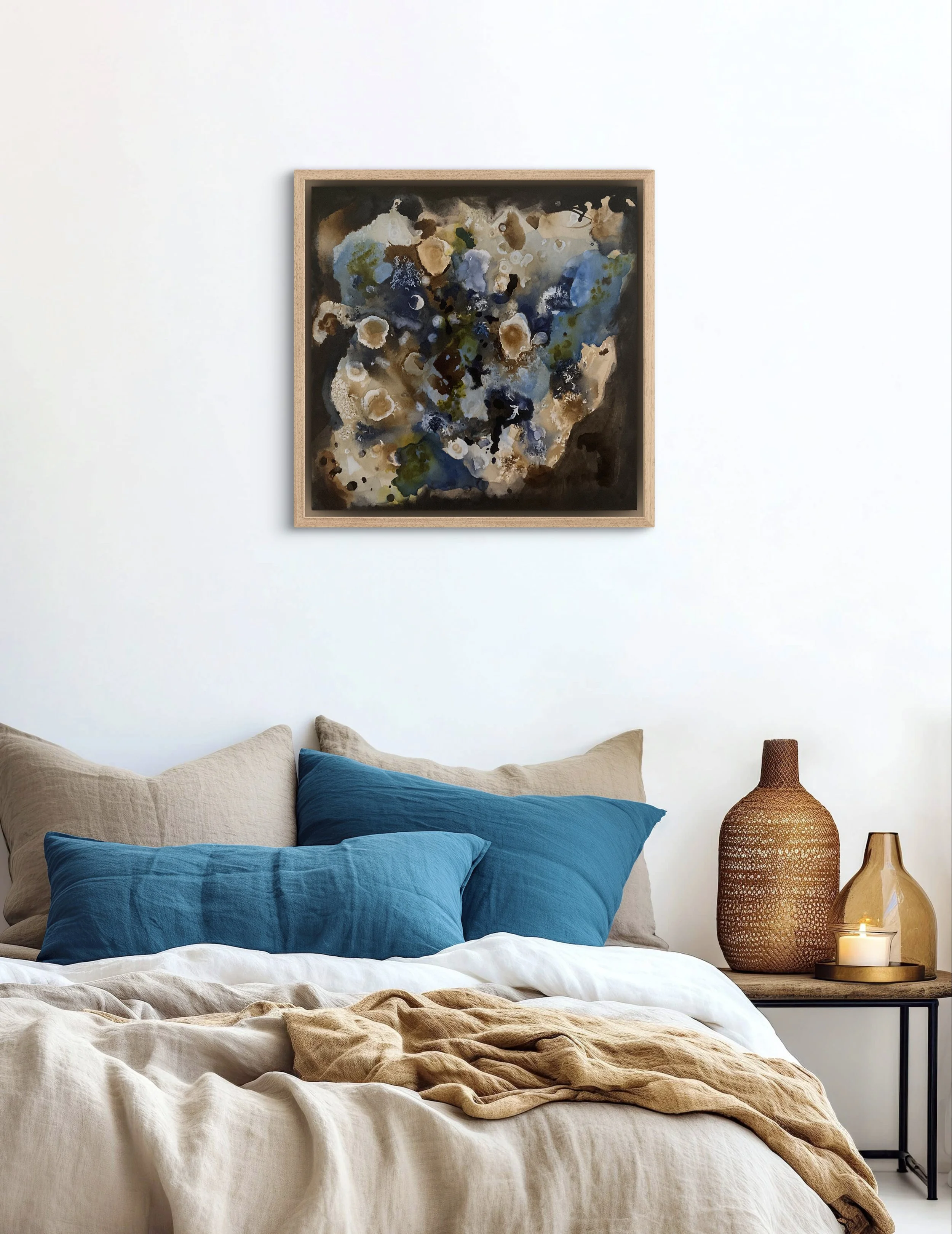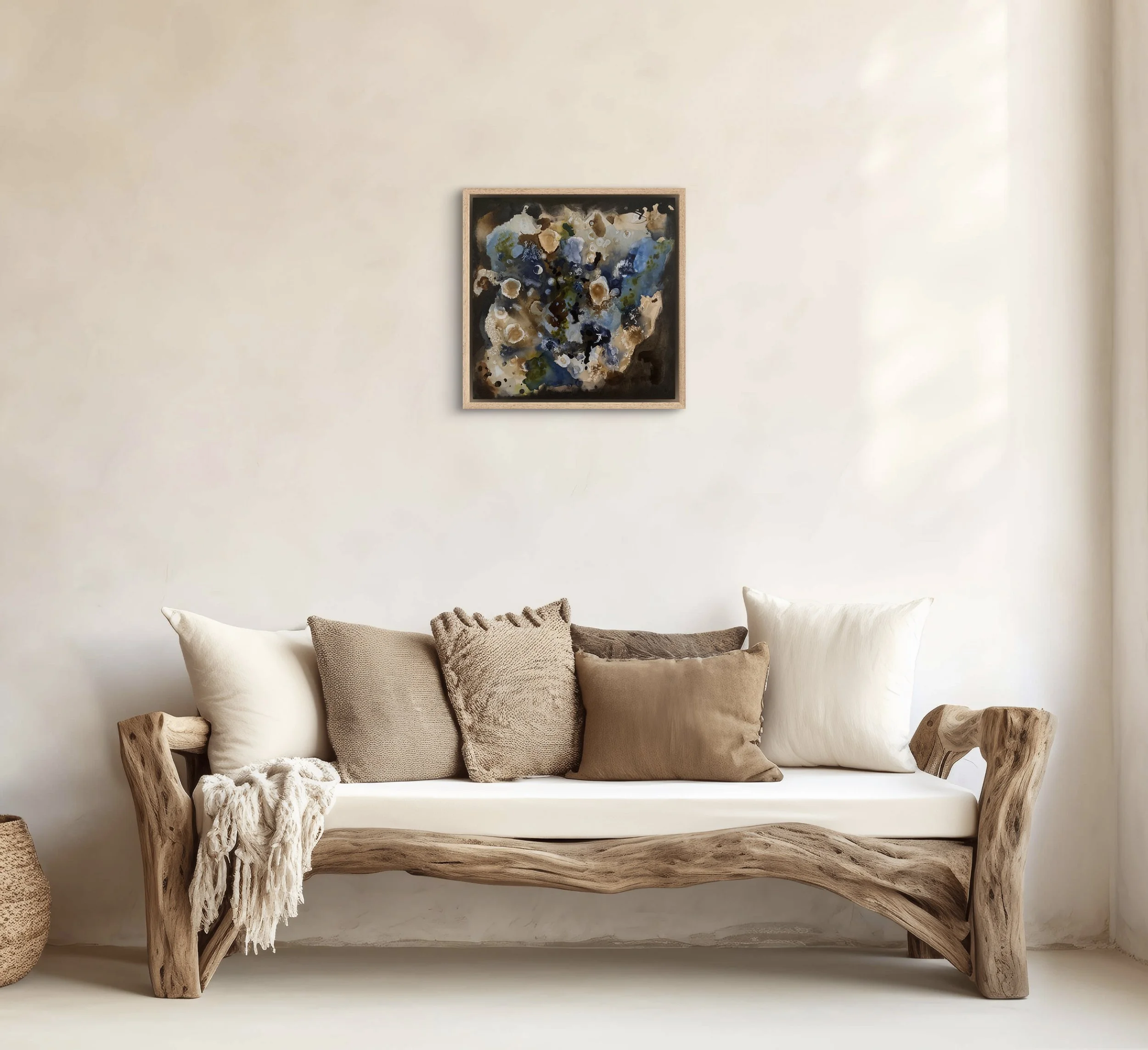 'Rock Pool' is a calming abstract painting that captures the quiet magic of low tide. Inspired by shoreline walks, this piece evokes the stillness and texture of hidden coastal pools. A natural palette of blues and earthy browns reflects the meeting of water, sand, and stone.